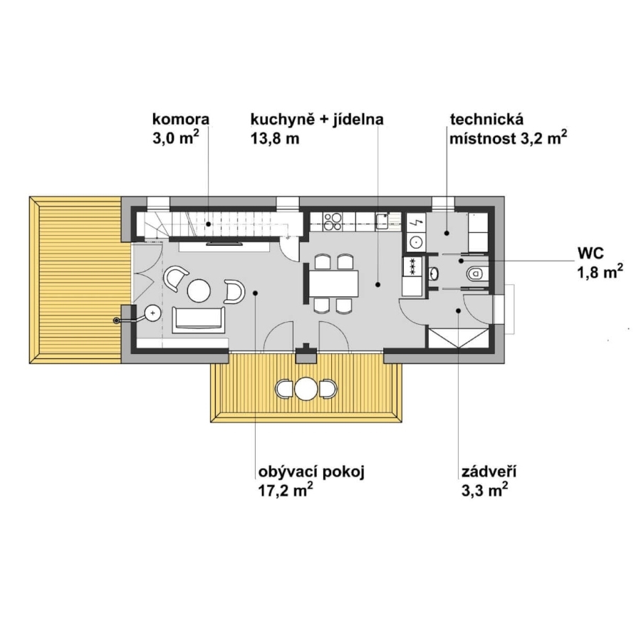 Rodinný dům Natura Timber B31 je patrový dům s denní obytnou částí a vstupem do domu v přízemí a s privátní / odpočinkovou částí s domácí pracovnou / pokojem a ložnicí v obytném podkroví.