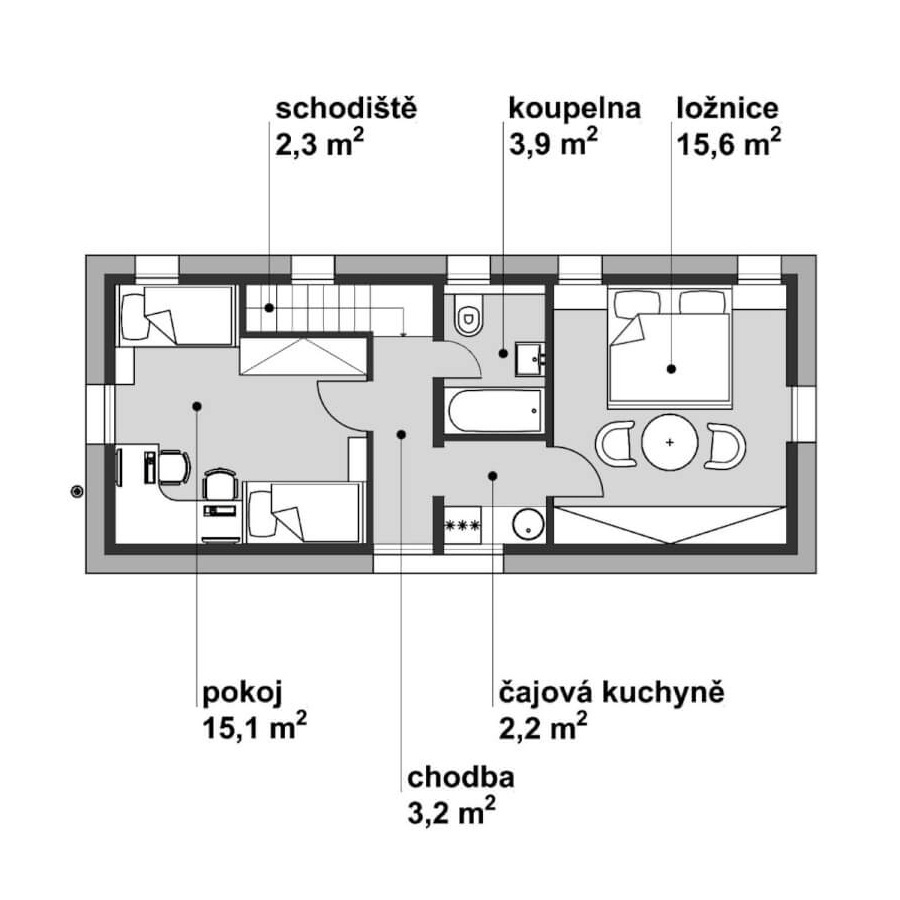 Z pracovny je přístupná koupelna se zavěšenou WC mísou, umyvadlem a sprchovým koutem a dále průchozí čajová kuchyňka, která je předsíní před ložnicí.